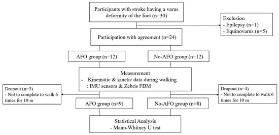 Thirty stroke patients with a varus deformity of the foot were recruited for screening from S, C, and J Hospitals in the Republic of Korea. Six patients (epilepsy: 1, equinovarus: 5) were excluded from the study. All participants voluntarily agreed to take part in the study. The inclusion criteria were as follows: (a) a diagnosis of hemiplegia due to cerebral hemorrhage or infarction, (b) the presence of a rearfoot varus deformity, (c) the ability to follow simple instructions, and (d) the ability to walk independently or with the use of an ambulatory aid. The exclusion criteria were (a) a history or current orthopedic issues affecting the foot, (b) bilateral leg problems, (c) a score of 3 or higher on the Modified Ashworth Scale, and (d) the presence of an equinus deformity. Of the 24 participants, 12 were assigned to the AFO group, consisting of those who walked with AFOs, and 12 were assigned to the No-AFO group, consisting of those who walked without AFOs. The general characteristics of the participants are presented in Table 1 and Table 2. The flow chart was shown in Figure 1. This study was conducted with the approval of the Hoseo University Institutional Review Board (1041231-190624-HR-092-06).