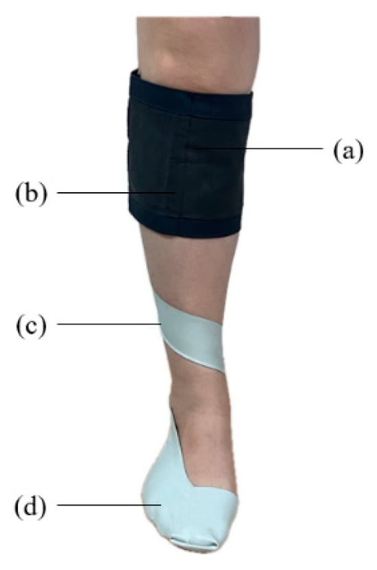 The EN-AFO device in use. (a) Velcro straps; (b) fabric belt with elastic reinforcement; (c,d) elastic bands securing the lower leg and forefoot.