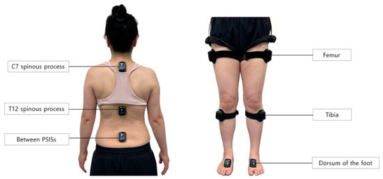 The Noraxon MyoMOTION motion analysis system (100 Hz, Noraxon USA Inc., Scottsdale, AZ, USA) was used to analyze kinematic variables (Figure 2). This system utilizes small inertial measurement units (IMUs), which are capable of measuring the 3D angular orientation of body segments. IMUs overcome the limitations of traditional optical motion capture systems, which may fail to track movement if the subject’s motion is occluded by the camera [21]. The IMU system has a dynamic measurement accuracy of 1.2 degrees [21].