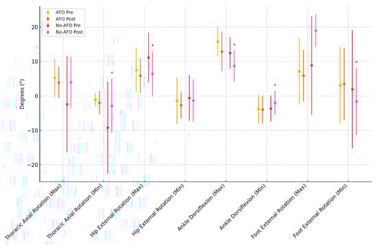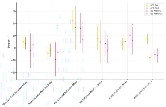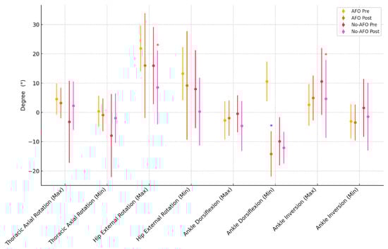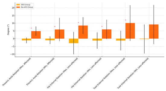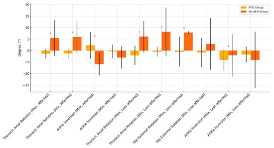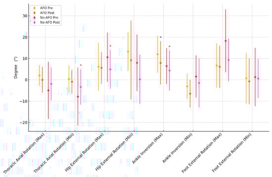 In the AFO group during the swing phase, the minimal ankle dorsiflexion of the affected limb significantly decreased from −10.61° (SD 6.76) to −14.17° (SD 7.75) (p = 0.038). Additionally, the maximal ankle inversion of the less-affected limb significantly decreased from 12.01° (SD 8.64) to 7.95° (SD 10.11) (p = 0.021) (Table 3, Figure 8). In the No-AFO group during the swing phase, the maximal hip external rotation of the affected limb significantly decreased from 15.97° (SD 13.12) to 8.53° (SD 12.58) (p = 0.036), and the maximal ankle inversion significantly decreased from 10.56° (SD 11.40) to 4.63° (SD 13.26) (p = 0.025) (Table 3, Figure 8). On the less-affected limb, the maximal thoracic axial rotation significantly increased from −4.93° (SD 13.37) to 1.10° (SD 8.36) (p = 0.036), and the minimal thoracic axial rotation also significantly increased from −7.85° (SD 13.58) to 0.32° (SD 5.55) (p = 0.025). Furthermore, the maximal hip external rotation significantly increased from 10.63° (SD 6.41) to 18.49° (SD 11.34) (p = 0.025), and the maximal foot external rotation significantly increased from 9.27° (SD 16.84) to 18.27° (SD 21.10) (p = 0.036) (Table 3, Figure 9).