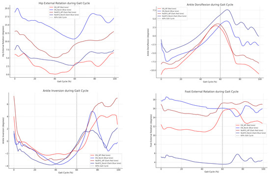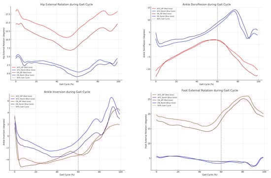 Gait cycle in the No-AFO group: hip external rotation, ankle dorsiflexion, ankle inversion, and foot external rotation.