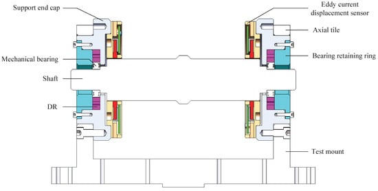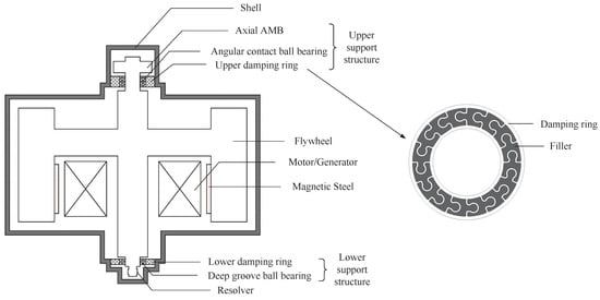 The upper support structure consists of an axial AMB and an upper damper from top to bottom. The axial AMB utilizes permanent magnet biased hybrid magnetic bearings. The upper damper is composed of a mechanical bearing and DR, which is used to reduce the amplitude when the rotor passes the critical speed and to enhance the system stability. The mechanical bearing comprises a pair of angular contact ball bearings.