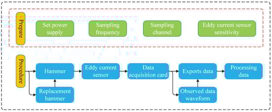 The stiffness and damping coefficient of the DR will be given experimentally in the next section. A parameter measurement device for DR is illustrated in Figure 5, which mainly includes the shaft, mechanical bearing, DR, support end cap, bearing retaining ring, test mount, eddy current displacement sensor, axial tile. The experimental measurement steps of DR are shown in Figure 6, which mainly includes the preliminary work and experimental steps. In the preliminary work, the power supply should be set. The voltage is set to plus or minus 5 V, and the current is set to 0.1 A. Next, the sampling frequency of the eddy current displacement sensor is set to 5000 Hz. Then, check and ensure that the data of the 8 sampling channels are normal. Finally, the sensitivity of eddy current displacement sensor is calculated and measured several times. Next is the experimental step. Each time, the force hammer is struck on the shaft, and then the data are collected by the eddy current displacement sensor. In the course of the experiment, a number of experiments were carried out according to the rotation of the damping ring 90° each time, and a variety of hammer heads (metal hammer, plastic hammer) were replaced. The data in the experiment process can be observed in real time on the monitor, and finally, the data are processed in MATLAB-R2022a. This paper is based on the method of free vibration attenuation to perform post-processing on the measured data. And the damping and stiffness of the DR are mainly fitted through Equation (16). Finally, the results of the analysis of multiple sets of experimental data were averaged.