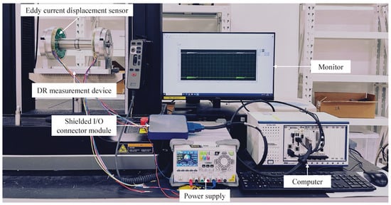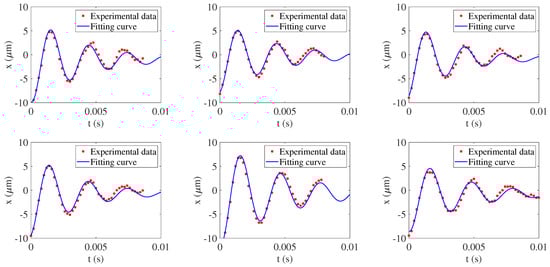 The experimental platform of DR is shown in Figure 7, which contains power supply, shielded I/O connector module, monitor, measurement device of DR, eddy current displacement sensor, computer. The experimental data of DR were fitted and calculated; the fitting curve is shown in Figure 8, and the statistical results are shown in Table 2. According to Table 2, the fitting coefficients R of the data of 6 groups are above 0.96, and the maximum SSE is 20; the fitting effect is indicated very well. The maximum and minimum values of data of each set were deleted separately and then averaged. The average damping coefficient c was 1.66 × N·s/m, the average damping ratio was 0.118, and the average stiffness k was 7.29 × N/m. The values of the experimental results of the DR are given in Table 3, and these data will be utilized for the simulation analysis later.