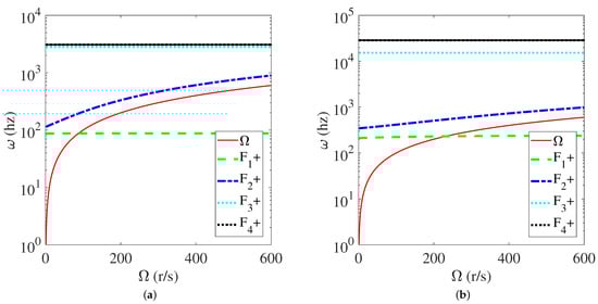 Critical speed is one of the most significant parameters of FESS. The working speed of the rigid rotor is generally required to meet , and flexible rotors are usually required to meet []. and are the first- and second-order critical speeds, respectively. The Campbell diagrams of the FESS with DR and mechanical bearing are shown in Figure 12. Only the forward whirling is shown, because the backward whirling is stable. The forward whirling is represented by “+”. As shown in Figure 12, the critical speed of the mechanical bearing FESS is 13,860 rpm, which is close to the working speed and does not meet the above requirements. The critical speed of FESS with DR is 5280 rpm, which meets the requirement of working speed. Therefore, the FESS with DR device can run smoothly under the working speed.