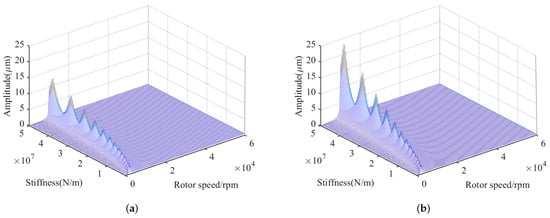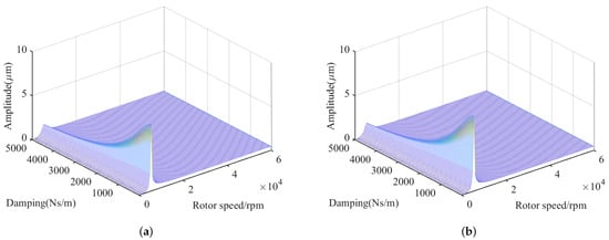 The unbalanced response of FESS is analyzed; the unbalanced mass parameters should be given first. According to the previous unbalance measurements of the flywheel, the unbalance at the upper end face of the flywheel is about 1 × kg m, and the unbalance at the lower end face of the flywheel is about 1 × kg m. The variation of unbalance response with stiffness at the upper bearing and the upper end face of the flywheel is presented in Figure 13, where the stiffness varies in the range of 5 × ∼5 × N/m. As shown in Figure 13, the critical speed of FESS increases gradually with the increase in stiffness. The unbalanced response regularly increases first and then decreases, but the overall trend increases. Figure 14 shows the variation of the unbalance response with damping at the upper bearing and the upper end face of the flywheel, where the damping varies in the range of 1∼5000 N·s/m. As shown in Figure 14, the critical speed of the FESS rarely changes but the unbalance response decreases gradually with the increase in the damping. In addition, the overall amplitude at the upper end face of the flywheel is a bit larger than that at the upper bearing, both with the change of stiffness and damping. This demonstrates that the stiffness and damping changes have a greater effect on the amplitude at the upper end face of the flywheel.