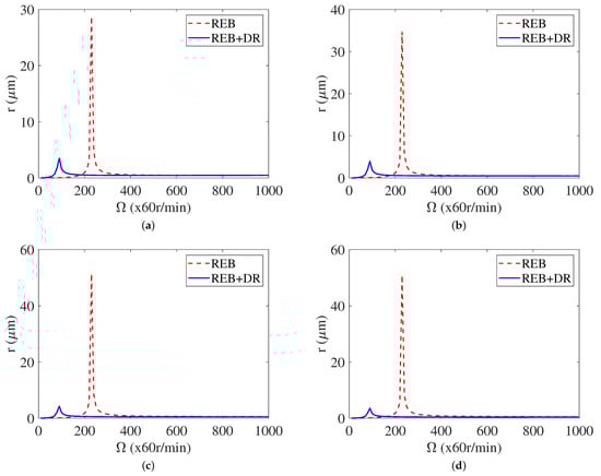 In order to further illustrate the effectiveness of the DR, the unbalanced response of the mechanical bearing FESS and the FESS with DR is compared. A comparison of the unbalanced response of the bearings and the end faces of the flywheel is given in Figure 15. As shown in Figure 15, the unbalance response of the mechanical bearing has a maximum of 51.4 m and a minimum of 28.7 m. And the unbalance response of the FESS with DR is 4.2 m at maximum and 3.5 m at minimum. The unbalanced amplitude of the FESS with DR is significantly reduced; the maximum reduction is 93.11% at the lower bearing and the minimum reduction is 87.8% at the upper bearing. It can be seen that the unbalance response can be effectively suppressed by introducing the DR device into the FESS of mechanical bearings.