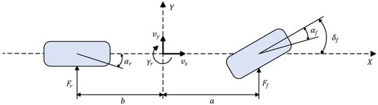 In the above expressions,  denotes the vehicle mass,  corresponds to the vehicle speed,  represents the lateral velocity of the vehicle,  denotes the yaw rate,  signifies the lateral displacement of the vehicle,  stands for the yaw angle of the vehicle,  is the moment of inertia of the vehicle about the -axis,  and  are the distances from the center of gravity to the front and rear axles. Furthermore,  and  denote the lateral forces on the front and rear wheels. Assuming a small tire slip angle,  and , where  and  denote the lateral stiffness of the front and rear wheels, and  and  represent the slip angles of the front and rear wheels, respectively.