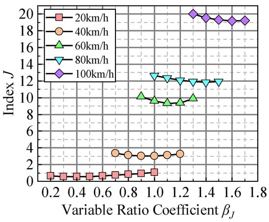 To examine the outcomes of diverse comprehensive performance indicators across varying variable transmission ratio coefficients , dual-lane change test conditions were chosen for simulation. The human–vehicle simulation system was utilized to characterize the vehicle’s steering performance, with the vehicle speed ranging from 20 to 100 km/h. Figure 3 and Figure 4 illustrate the findings of the simulation experiments.