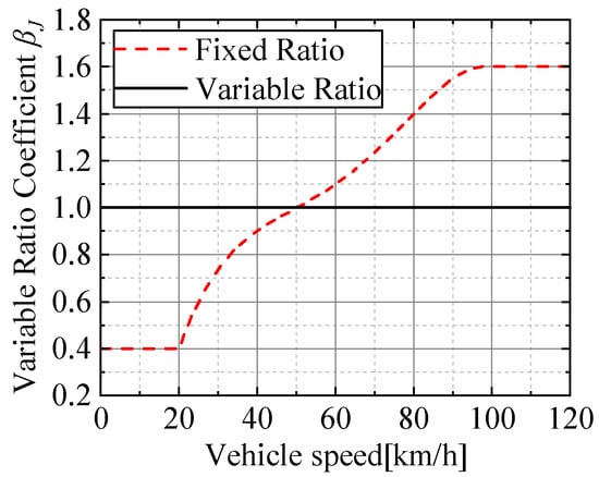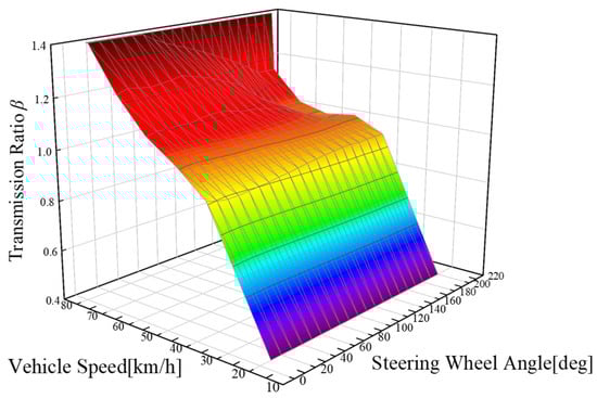 In the equation,  represents the transmission ratio from the steering wheel to the front wheels of the vehicle,  denotes the steering wheel angle,  signifies the front wheel angle,  represents the steering actuator angle,  stands for the variable transmission ratio coefficient, the designated design target, and  denotes the fixed transmission ratio of the mechanical structure.