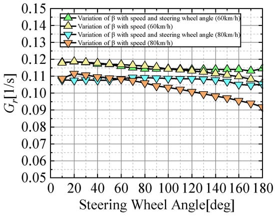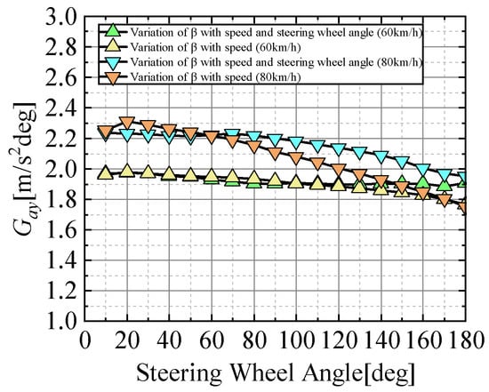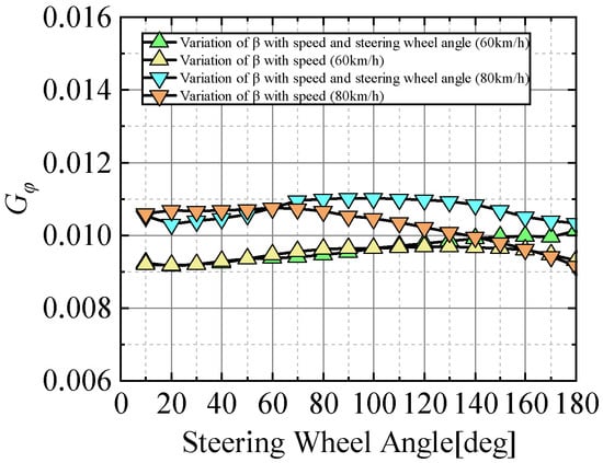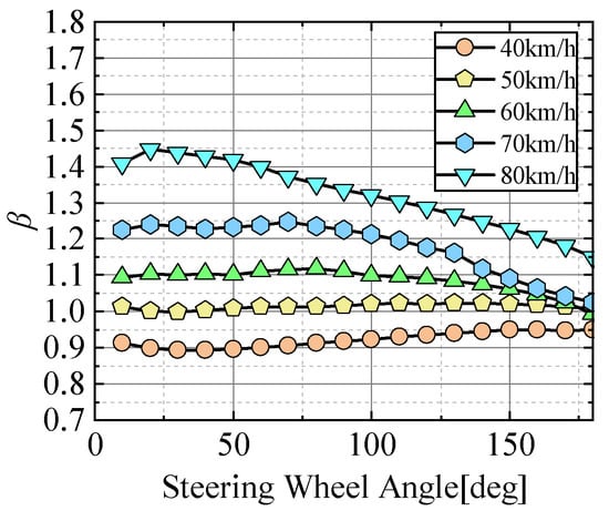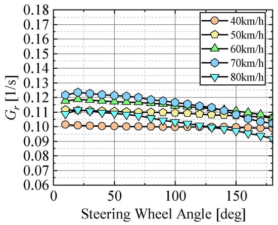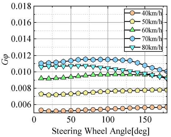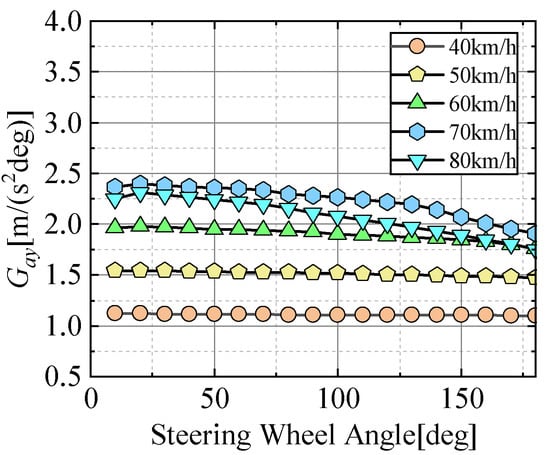 Figure 5, Figure 6 and Figure 7 illustrate the characteristics of vehicle steering gain under a fixed steering ratio. It can be observed that as the steering wheel angle increases, the yaw rate gain of the vehicle decreases, the lateral acceleration gain also decreases, and the roll angle gain initially increases and then decreases. Furthermore, as the vehicle speed increases, the decline in steering gain becomes more noticeable. This acceleration is attributed to the tires entering the nonlinear region more swiftly, resulting in diminished maneuverability across a broad spectrum of steering angles. To improve the vehicle handling performance, a variable transmission ratio coefficient is utilized to ensure that the vehicle’s steering gain remains relatively consistent concerning the steering wheel angle. Examination of Figure 5, Figure 6 and Figure 7 reveals a consistent gain at small angles. Hence, this gain is chosen as the desired steering gain , ,  corresponding to the specific vehicle speed.