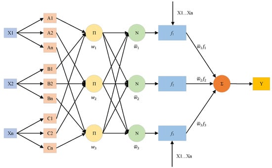 The initial layer is the input node layer. This layer’s purpose is to conduct fuzzification on the input variables. Each node possesses a node function, and the node function of the nth node is a quadratic function, as depicted in the following formula: