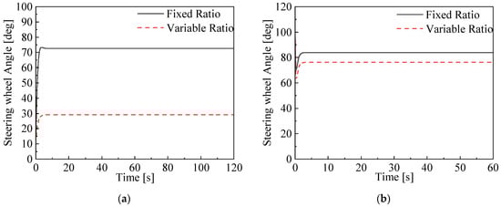 Simulation results of the steady-state circle test: (a) 20 km/h working condition; (b) 40 km/h working condition.