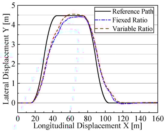 Figure 12 illustrates the vehicle trajectory under the experimental conditions, depicting the predetermined reference path, the vehicle trajectory under the variable transmission ratio system, and the vehicle trajectory under the fixed transmission ratio system. Table 3 presents the recorded steering control evaluation metrics for both variable and fixed transmission ratios. By combining the information presented in Figure 12 and Table 3, improvements are observed in the performance of the angular velocity metric, lateral acceleration metric, and roll angle metric. This suggests that the controller has traded off a portion of the lateral error performance metric to enhance the overall evaluation index performance. The findings further reveal that the evaluation metrics for the SBW system with variable transmission ratio control are consistently smaller than those of the fixed transmission ratio system. This substantiates the claim that variable transmission ratio control contributes to the enhanced maneuverability and safety of the vehicle.