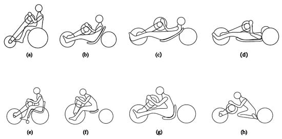 Schematic of the most common kinds of handbike architectures, divided into arm propulsion on the upper row, and arm trunk propulsion on the lower row, with: (a) attach unit handbike, (b) recumbent 60° rigid frame, (c) recumbent 30° rigid frame, (d) recumbent 0° rigid frame, (e) attach unit handbike, (f) car-seat, (g) long-seat, and (h) knee-seat.