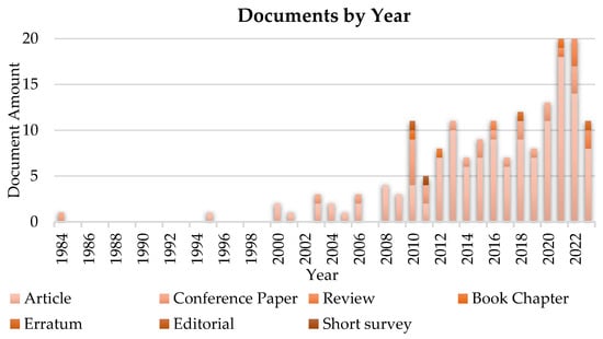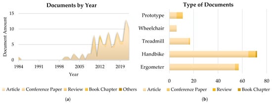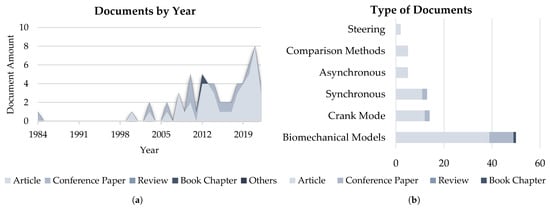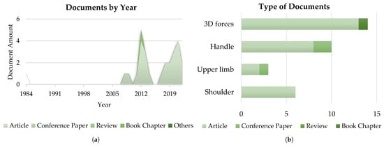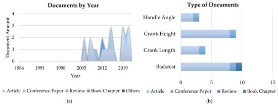 According to the Scopus database, the interest of the scientific community in handbikes and their features has remarkably increased since 2008, reaching a peak in 2021 and 2022 with 20 published documents every year, as Figure 3 depicts. Within all the published documents, only seven were classified as reviews according to Scopus.
