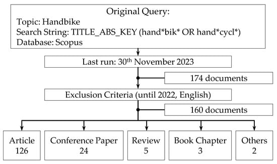 The research was performed querying the Scopus database with the string TITLE-ABS-KEY ( hand*bik* OR hand*cycl* ). The last query was run on the 30 November 2023, providing 174 results, classified according to the Scopus database as follows: 136 articles, 24 conference papers, 7 reviews, 3 book chapters, 2 errata, 1 editorial, and 1 short survey.