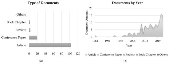 Figure 4 presents a schematic of the applied data selection process, whereas Figure 5a,b depict the distribution of the results as total number of documents by type and their evolution in time, respectively.