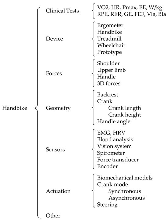 - Sensors. This class gathers the works dealing with sensors and measurement systems used to access the performance of the subject and/or the handbike, both in laboratory and outdoor environments, for tests, sport practice, and race conditions. No distinction in the inclusion was made between papers presenting custom-made systems and works using commercial sensors.