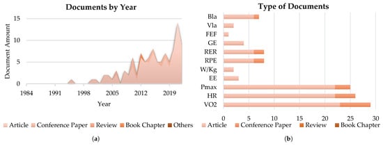 Figure 7b presents the distribution of identified documents among the sub-fields of the clinical test category: the most studied quantities are the maximal oxygen uptake (VO2), with 29 documents, then heart rate (HR) and maximum pressure (Pmax), with 26 and 25 documents, respectively. The graph also allows capturing the distribution by type of document. In more detail, most of the products are classified as articles, followed distantly by conference papers.