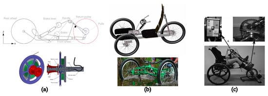 Handbikes are vehicles composed of two-rear wheels and one front wheel. The latter is connected to a handle through a roller chain, which is able to increase the mechanical efficiency, with respect to traditional wheelchairs, up to 15 []. Handbikes may present various architectures to adapt to the needs of different users. Figure 1 collects the most common kinds of handbikes. Besides the most traditional solutions, nowadays hybrid devices are also available, which functionally transform wheelchairs into handbikes by adding custom or off-the-shelf attachments to traditional wheelchairs. In the present work, only integrated devices, realized as a whole to enable handcycling, and often referred to as fixed-frame devices, will be properly considered as handbikes; hybrid solutions will be also partially described, but an analysis of these systems is outside the main purpose of the present work. Figure 2 presents an example of the considered handbikes, depicting the main components of this kind of devices and synthesizing the basic applied nomenclature.