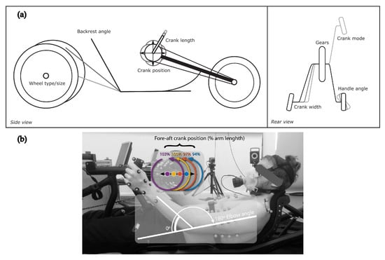 - Stone, B.; Mason, B.; Warner, M.; Goosey-Tolfrey, V. Horizontal Crank Position Affects Economy and Upper Limb Kinematics of Recumbent Handcyclists. Med. Sci. Sport. Exerc. 2019, 51, 2265–2273. [Google Scholar] [CrossRef]