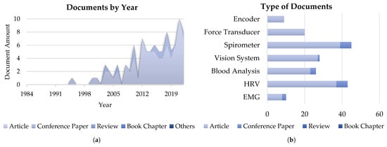 There were 107 documents classified in the clinical test category, and these were distributed among 95 articles, 11 conference papers, and 1 book chapter, as Figure 7a shows. The number of published documents, and number of articles in particular, has especially increased in the last twenty years, with a peak of 14 articles reached in 2021.