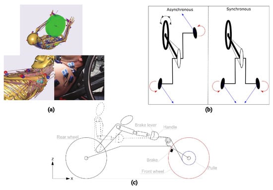 The kind of propulsion can also be classified into two types: synchronous and asynchronous. According to the works conducted by Kraaijenbrink et al. [,], the synchronous mode with the extra use of trunk is the more efficient way to propel a handbike in terms of power production and vehicle conduction.