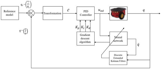 In this section, an indirect adaptive PID controller based on an NN for WMR trajectory tracking is introduced, as illustrated in Figure 2. The distinctive feature of the indirect adaptive controller lies in its capacity for online identification of the system parameters. The identification process is facilitated by the NN, which assumes a pivotal role in extracting system parameters. This dynamic learning mechanism enables the tuning of PID parameters through the SGD algorithm [40]. Moreover, in order to underscore the significance of this integration, adaptability to complex and nonlinear dynamics is offered by the NN, allowing the trajectory tracking system to effectively navigate uncertainties. Concurrently, a crucial role in real-time weight adaptation for the NN is played by the DEKF, ensuring that the learning process is guided by precise feedback. This deliberate integration of an NN and DEKF enhances the adaptability, learning capabilities and overall robustness of the trajectory tracking system, making it well-suited for navigating challenging dynamics and uncertainties.