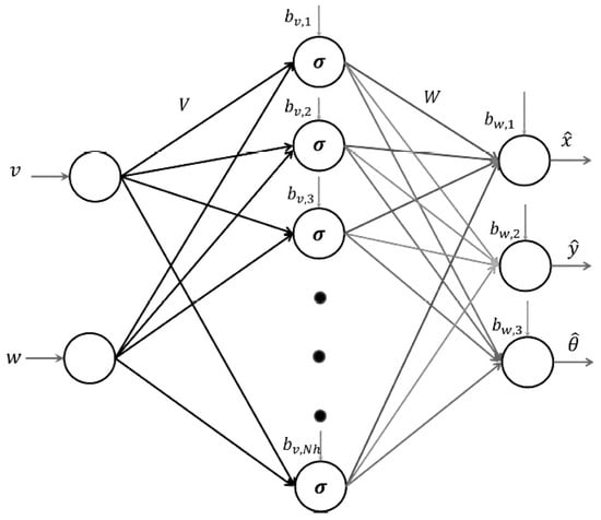 The neural network (NN) serves the purpose of recognizing and approximating the robot system. Illustrated in Figure 3, the NN identification topology comprises a single hidden layer, an input layer with two inputs and an output layer with three outputs. The neural network’s inputs, denoted as , correspond to the linear and angular velocity components, while its output is the predicted state of the mobile robot. The determination of the NN outputs is outlined as follows: