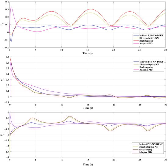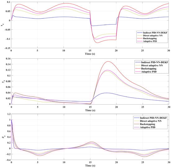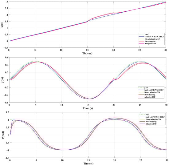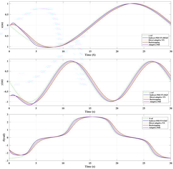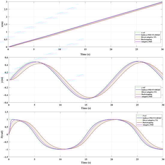 Quantitative analysis further supports the superior performance of the IAPID-NN-DEKF scheme. The root mean squared error (RMSE) values for different control strategies indicate a noticeable reduction in trajectory tracking error: emphasizing the enhanced accuracy achieved by the proposed controller. IAPID-NN-DEKF outperforms DA-NN, BSC and the adaptive PID control strategies in terms of RMSE, showcasing its effectiveness at achieving accurate control and state estimation. In conclusion, the IAPID-NN-DEKF scheme demonstrates a high level of superiority for mobile robot trajectory tracking. The integration of adaptive control through an NN and DEKF contributes to the scheme’s adaptability to dynamic environments, computational efficiency and improved accuracy in state estimation. This research significantly advances the field of robust control techniques for WMRs and provides valuable insights into the potential of the proposed IAPID-NN-DEKF approach for real-world applications.