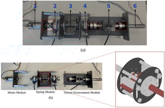 Two pictures of the Forecast testbed where (a) represents the configuration of a Series Elastic Actuator (SEA). (b) highlights each module and emphasizes the easy-to-configure idea. Also, a detailed CAD view of the leaf spring mechanism within the spring module can be observed. The red parts are fixed to the motor shaft while the gray parts are fixed to the virtual environment module.