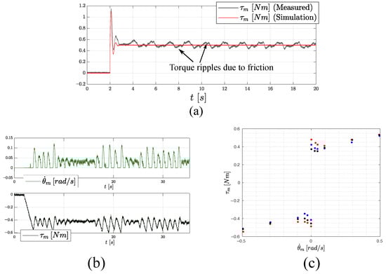 Figure 2a considers experimental and simulated actuator torques during a proportional-integrative () velocity control with P = 0.1 and I = 10. The values of P and I are manually adjusted to reach a stable and smooth control. By looking at the figure, the reader can observe periodic friction ripples on the measured motor torque . Figure 2b highlights how diverse and uncertain stick-slip phenomena significantly affect the actuator velocity () and torque (). Figure 2c reports three different friction identification experiments considering three different initial positions of the actuator to highlight the diverse stiction effects and Stribeck curves. Each dot in the figure comes from a single experiment and is obtained by averaging the measured velocity and torque values. For each of the three initial configurations, a total of 12 experiments were conducted (six experiments considering positive torques and velocities and six experiments considering negative torques and velocities). Each color corresponds to a set of experiments associated with a specific initial configuration. Data were collected in an open loop at zero velocity to improve the identification of the static friction and under the feedback action of a velocity control at low velocities to improve the identification of the Stribeck curve.