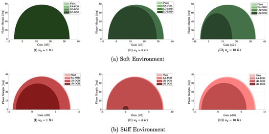 In this Section, we show that differently from the LO-DOB and the LD-DOB, the proposed EA-FOB does not significantly alter the inherent stability of the system and thus, guarantees a non-biased benchmarking process. The reason behind this comparison is that in many practical cases, DOBs may heavily alter the closed-loop stability. This happens because the DOB nominal model may be significantly different from the system dynamics and this leads to lower stability margins. In these cases, an aggressive filter is needed to mitigate such model mismatch and to guarantee closed-loop stability [,,]. However, using a slow filter may lead to some disadvantages, including the inability to reject high-frequency friction disturbances such as stiction and stick-slip effects. This requires redesigning the filter to find a reasonable trade-off between performance and stability robustness []. The focus of this section is to showcase that the EA-FOB can tolerate a reasonably high frequency filter while showing higher stability margins, despite environment uncertainties, with respect to other existing DOB-based force control approaches. As mentioned before, other DOBs are not suitable for our purpose since they cannot isolate friction effects, and they are considered here only for stability comparison purposes.
