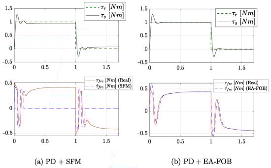 Simulations are carried out in Matlab considering the block diagram shown in Figure 5, where is a simple controller tuned to provide a control bandwidth around 10 Hz when interacting with a high-impedance environment (, = ). This leads to and . Simulation results are shown in Figure 7. The left side shows the results of SFM compensation while the right side shows the results of the EA-FOB compensation. The upper plots show the torque tracking performance, where is a square wave (drawn in gray) and is the spring torque (drawn in black). In the lower plots, (drawn in red) represents the simulated friction torque while (blue dashed line) represents the estimated friction torque. In the case of SFM, is defined as: