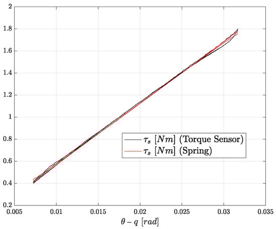 The objective of the experiments is to evaluate the friction compensation capabilities of the proposed EA-FOB and to validate the stability considerations reported in Section 5. Experiments are carried out using the Forecast testbed shown in Figure 1. In this setup, motors are driven in current control mode using a commercial driver (ESCON 50/5) while the force control algorithms run on an embedded board (Nucleo F446RE) as a periodic hard real-time process with a frequency of 2 kHz. Two optical encoders (DHO-05) with an extremely high resolution (2,000,000 pulses per revolution) are used to measure the motor position and the environment position q. The feedback torque is measured using spring deflection according to (1). Such spring has a linear stiffness profile and negligible inherent friction, as shown in Figure 8.