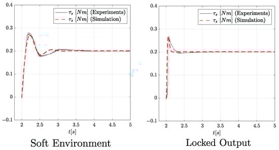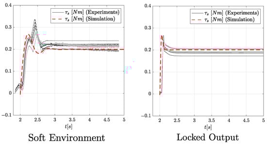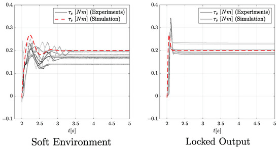 The main experimental results are reported in Figure 10, Figure 11 and Figure 12, showing for each plot the repeatability of the ten step responses. Figure 10 considers a PD control without any friction compensation, Figure 11 considers a PD with SFM friction compensation and Figure 12 considers a PD with EA-FOB friction compensation. In each Figure, the left plot refers to a soft environment interaction ( = 0.001 and = 5 ) while the right plot refers to a locked-output configuration, specifically chosen to represent the scenario with the highest possible environment stiffness. All the experiments consider a desired step reference. The same PD controller used in the simulation is considered (P = 5 and D = 0.1). The frequency of the EA-FOB is again set to 10 Hz.