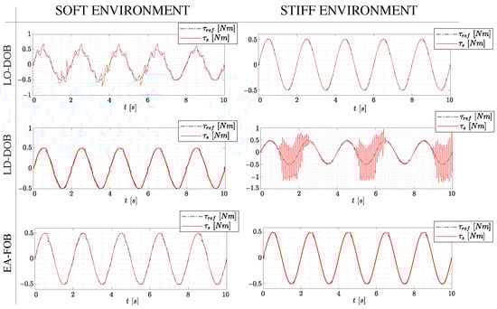 To assess the superior stability robustness of the EA-FOB with respect to an LO-DOB and LD-DOB, six different torque tracking experiments are conducted. Experiments consider a 0.5 Hz sinusoidal reference and the interaction with a soft and stiff environment. The tuning frequency of the filter is set to 10 Hz for all DOBs. Control responses are reported in Figure 13. In the case of a soft interacting environment, the LO-DOB response leads to undesired low-frequency oscillations. This reveals the presence of a complex conjugated pole pair which is related to lower stability margins. Similarly, the LD-DOB presents high-frequency vibrations when interacting with the stiff environment which again, can be related to lower stability margins. Instead, in all the experiments the EA-FOB shows accurate and non-oscillatory responses which can be related to higher stability margins.