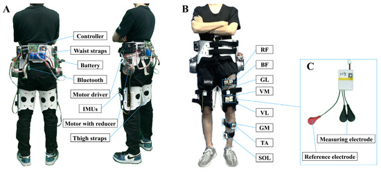 The powered joint module consisted of servo motors (Maxon EC 90 Flat, Maxon Motor Co., Ltd., Sachseln, Switzerland), customized planetary gear reducers (31.6:1), and motor drivers (ESCON 50/5 module, Maxon Motor Co., Ltd., Switzerland) positioned on the left and right sides of the hips, providing assistance torque ranging from 0 to 23 Nm for hip flexion and extension. Two inertial measurement units (IMU) (Shenzhen Witte Intelligent Technology Co., Ltd., Shenzhen, China), depicted in Figure 1A, were mounted on the front of both thighs, measuring hip flexion/extension angles and velocities. Surface electromyography (sEMG) signal sensors (Customized by College of Biomedical Engineering & Instrument Science, Zhejiang University) were used in the experiments, with a sampling frequency of 2 kHz [27]. Data of real-time transmission to the computer were achieved using WIFI. Multiple threads were employed to receive data from several sensors, parsing the communication data to obtain multi-channel sensor data. As shown in Figure 1B, sEMG sensors were used to capture sEMG signals from eight muscle sites on the left leg of the human body, including rectus femoris (RF), vastus medialis (VM), vastus lateralis (VL), biceps femoris (BF), gluteus maximus (GL), gastrocnemius (GM), tibialis anterior (TA), and soleus (SOL).
