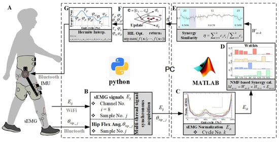 The sEMG signals and lower-limb kinematic data were transmitted to the upper-level computer via WIFI and Bluetooth, respectively, where all data processing tasks were conducted using MATLAB (MatlabR2020b, MathWorks Inc., Natick, MA, USA). Referring to the data preprocessing method of Zhang et al. [28], parameters were adjusted to preprocess the original sEMG signals. This involved second-order 20–300 Hz Butterworth bandpass filtering, full-wave rectification, and second-order 10 Hz Butterworth low-pass filtering. Subsequently, using kinematic data, such as angles and phases, collected by IMUs, the sEMG signals were segmented based on gait cycles and processed through an optimized Non-negative Matrix Factorization (NMF) method to compute muscle synergy, which is discussed further in Section 2.3. Finally, various gait evaluation parameters were obtained through a comparison with predefined standard assessment metrics in HIL optimization. The mean of the evaluation parameters obtained from multiple gait calculations was considered the evaluation metric for this iteration. In Python, using HIL optimization, iterative calculations yielded eight key parameters for the assistive configuration file. In Section 2.5, these parameters were then used to generate the assistive configuration file for torque control.