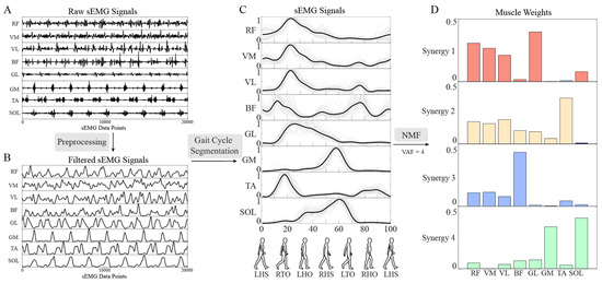 In this study, the process of analyzing synergies based on human experimental data is illustrated in Figure 3. The raw sEMG signal during walking (Figure 3A) underwent filtering (Figure 3B), and after gait segmentation and normalization, the preprocessed sEMG signal was obtained (Figure 3C), NMF was employed for extracting muscle synergies, ensuring the non-negative attributes of the decomposition matrix [29,30], thereby granting it greater physical interpretability compared with alternative decomposition methodologies. The expression is as follows: