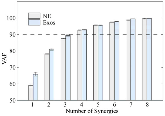 Total variability accounted for (VAF) versus the number of synergies based on NMF. NE and Exos stand for walking trials without and with exoskeleton, respectively. VAF gradually increased, with an increase in the number of synergies.