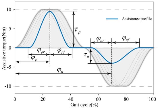 The assistive torque configuration was generated using a parameterized approach that allows for online adjustments. The gait cycle serves as the horizontal axis, while the assistive torque represents the vertical axis, with the moment of maximum hip flexion angle set as the starting point of a gait cycle. Previous studies configured the assistive torque within a cycle using four parameter points [33]. However, in the normal human walking process, hip joint flexion and extension torques are not symmetrical. To ensure accuracy in calculating the assistive torque profile and convergence speed, this study determined the assistive torque configuration for each gait cycle using eight parameters. These parameters included peak torque during flexion and extension , peak time of flexion and extension , rise time of flexion and extension , and fall time of flexion and extension .