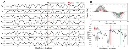 Human-in-the-loop optimization results: (A) Variation of each parameter with iteration. (B) The assistive torque profiles; (C) Evaluation index calculated in each iteration and optimization of evaluation index.