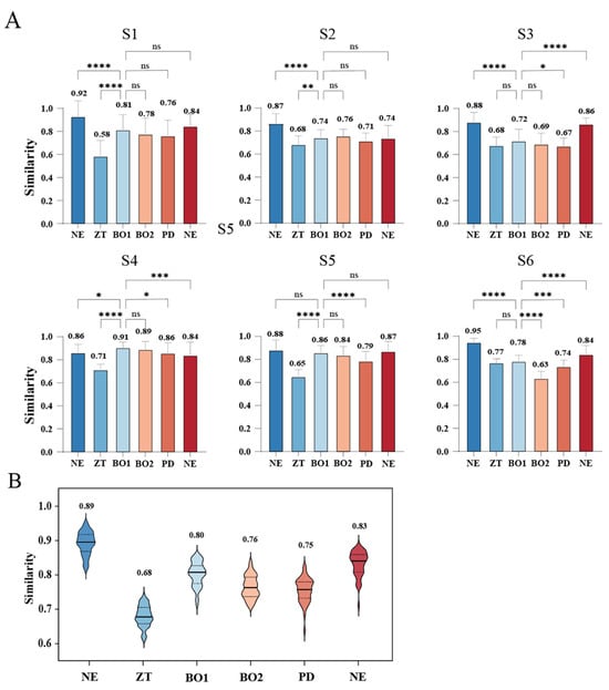 Evaluation of muscle synergy optimization: (A) Analysis of similarity indices under various individual conditions and their significance differences. Significance levels are denoted by asterisks: ns (p ≥ 0.05), * (p < 0.05), ** (p < 0.01), *** (p < 0.001), and **** (p < 0.0001); (B) Average similarity results among the subjects.