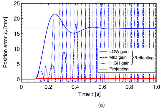 For the Force-Reflecting Type, we set three different position gains on the pneumatically driven follower: “LOW”, “MID”, and “HIGH”. The value of HIGH gain is equal to the position gain of the electric master. While the actual experimental system operated stably only at LOW gain, we show in this simulation that the system becomes unstable with larger values of . The velocity gains and are set as the critical damping factor of the mechanical vibration system.