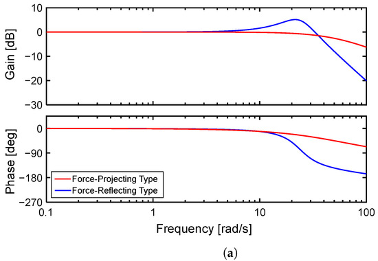 The results of the frequency response analysis for and for the two bilateral control laws are shown in Figure 6 and Figure 7. Because the Bode diagram is effective for stable systems, the analysis for the Force-Reflecting Type was performed only for the LOW gain [N/mm], where the step response was stable in both environments.