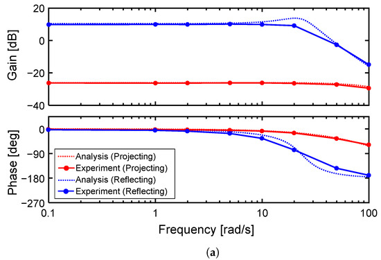 To analyze the frequency response, the objective transfer functions and are defined by the following Equations (18) and (19), respectively.
