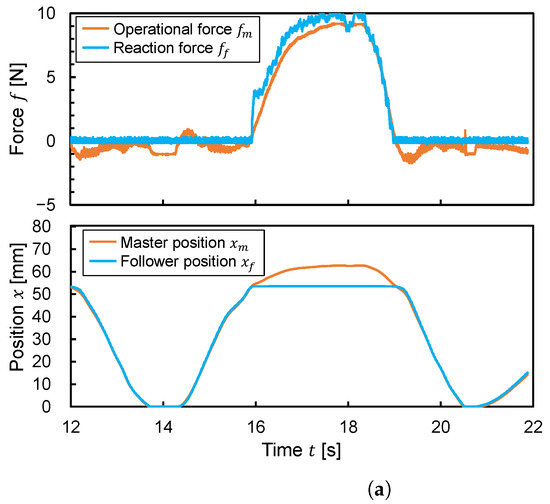 The results of the Force-Projecting Type showed that the operational forces during free movement were about 3 N, resulting in a slightly heavier operational feel than the Force-Reflecting Type. This is because, in the Force-Projecting Type, the follower dynamics (e.g., viscosity and friction of the pneumatic cylinder) need to be compensated by the master’s operational force. In addition, the error of the follower reaction force became larger when in contact with the SOFT environment. This may be because when the follower was back driven by a force from the environment, it was not only affected by the follower dynamics but also by frictional force on the master that was not modeled in the operational force estimator. Concerning position response, the system exhibited very good tracking performance, enabling accurate operation.