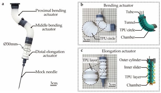 Figure 1b depicts the prototype and the cross-sectional image of the bending actuator. The bending actuator is embedded with three air chambers that are uniformly distributed along its circumference. This actuator can achieve omnidirectional bending movements by regulating the inflation pressures of its chambers. The current bending actuator is an enhanced version of our earlier design []. Distinct from the previous design, an array of thermoplastic polyurethane (TPU) circles is attached to the surface of the bending actuator. These TPU circles play a key role in limiting the radial expansion of the actuator, thereby enhancing the repeatability of the bending deformation. Figure 1c illustrates the elongation actuator that is embedded with a bellows-like air chamber. Similar to the bending actuator, TPU layers are attached to the surface of the elongation actuator to restrict the radial expansion. The elongation actuator enables linear movement when pressurized, thereby fulfilling the function of needle insertion.